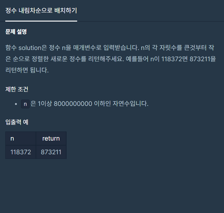 [프로그래머스] 정수 내림차순으로 배치하기 본문