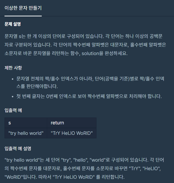 그래서 다른 사람들의 풀이를 보니 " " 를 만난 경우 인덱스를 0으로 돌린 뒤 짝홀을 따지게 하였다.