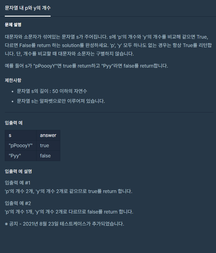 처음에 제출했던 코드인데 테스트케이스가 추가되면서 틀린 답이 되었다. p 와 y가 모두 없는 경우 때문이다.