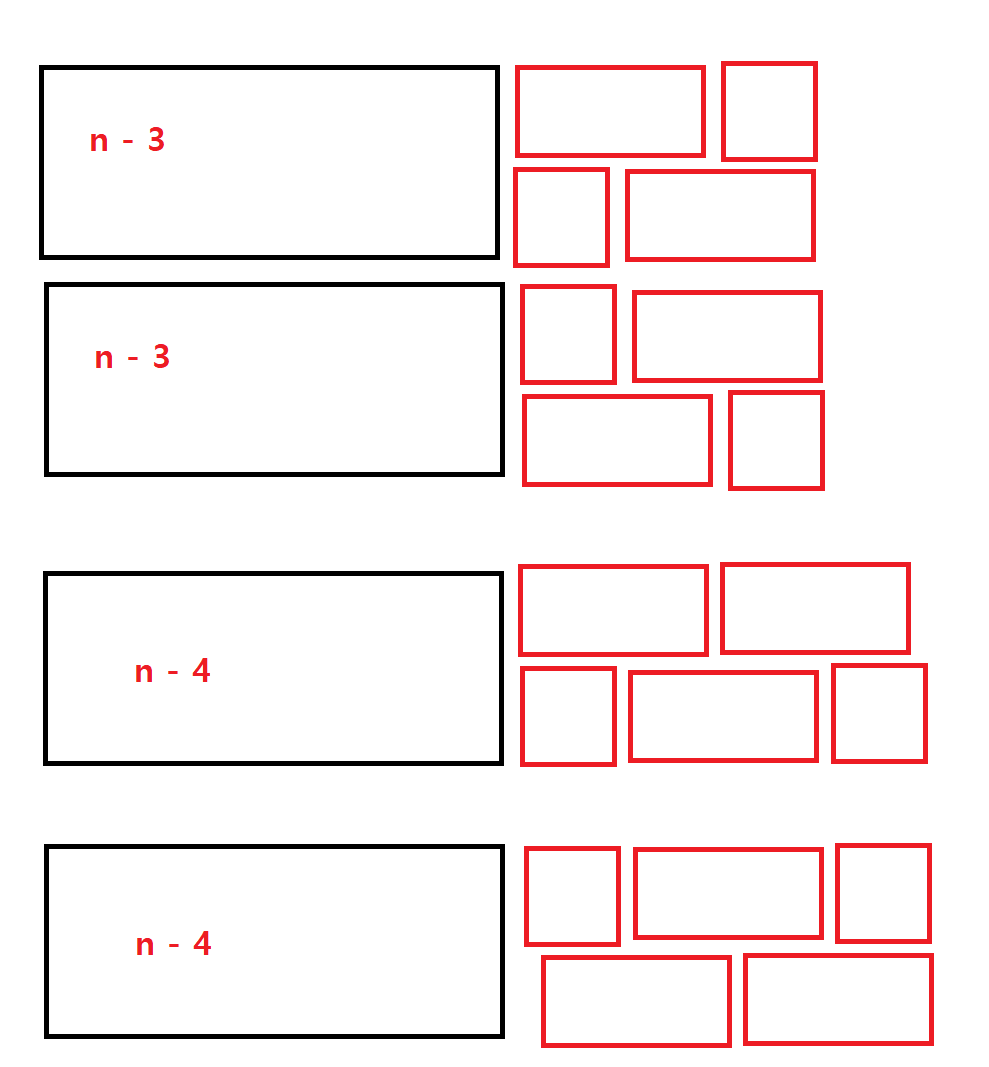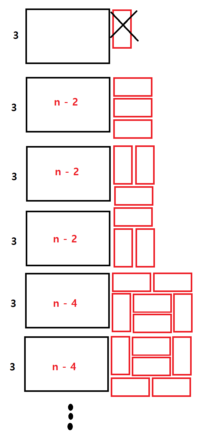 그래서 식은 3 * 재귀함수(n - 2) + 2 * (n - 4) + 2 * (n - 6) ... 2 * (n - n) 이다.