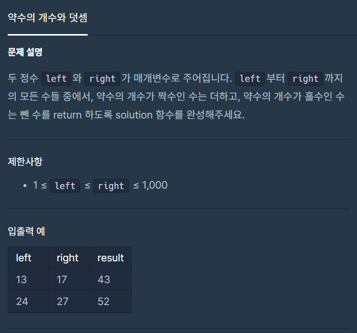 [프로그래머스] 약수의 개수와 덧셈 본문
