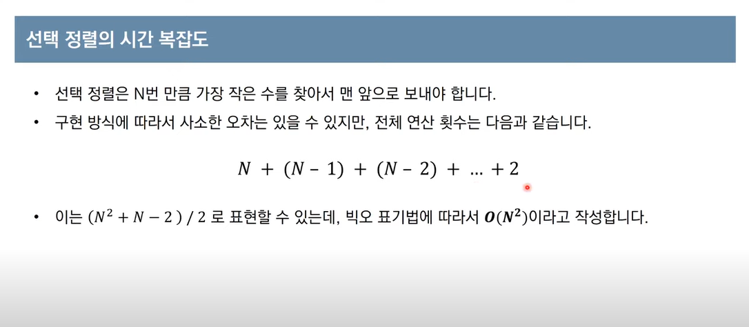 - 처리되지 않은 데이터 중에서 가장 작은 데이터를 선택해 맨 앞에 있는 데이터와 바꾼다 * n
