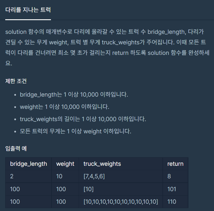 [프로그래머스] 다리를 지나는 트럭 본문