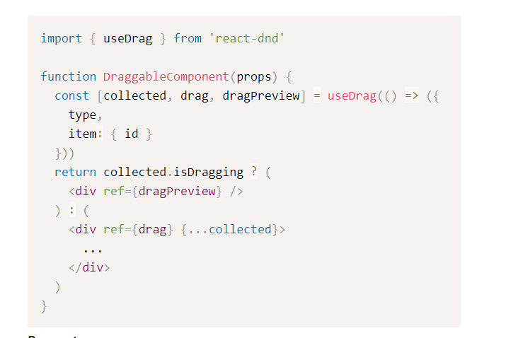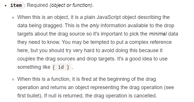 item 울 보면 useDrag 에서 drag source를 가지고 있는 유일한 부분이라고 설명한다. 그리고 두번째 문단을 보면 fire를 발사라고밖에 단어 표현이 안되는데 여튼 드래그 동작초반부터 발사되고 object를 리턴한다고 되어있다. null 일 경우 동작이 중지된다는 거 보면 null 일 경우 아무리 끌어당겨도 preview 이미지만 움직이거나 아예 안 움직일 것 같다.