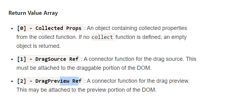 저 사이트의 설명을 보면 useDrop 훅은 배열을 return 해준다고 한다. 그 배열 안에는 Collected Props, DragSource Ref, DragPreview Ref 가 존재한다.