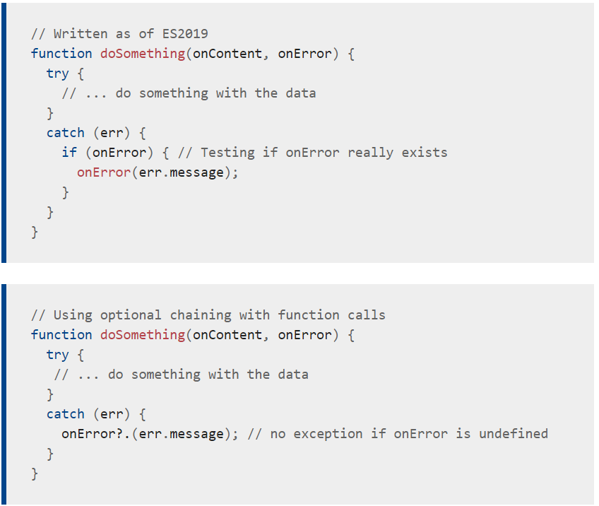 위에 참조해놓은 모질라 사이트 내용을 더 뜯어 보니까 optional callbacks라고 nullish한 매서드를 호출할 때 optional chaining을 사용할 수 있다고 한다. (하지만 속성에 해당 이름이 있지만 함수가 아니라면 exception이 발생할 수 있으니 주의해야 한다고.)