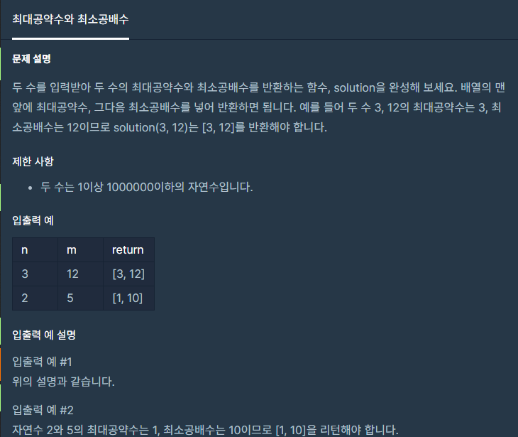 두 수를 입력받아 두 수의 최대공약수와 최소공배수를 반환하는 함수, solution을 완성해 보세요. 배열의 맨 앞에 최대공약수, 그다음 최소공배수를 넣어 반환하면 됩니다. 예를 들어 두 수 3, 12의