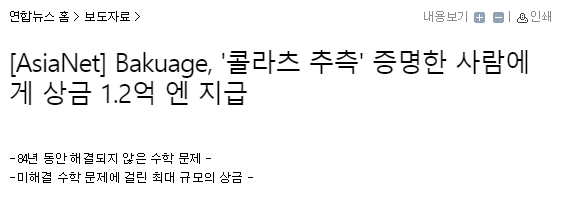 [AsiaNet] Bakuage, '콜라츠 추측' 증명한 사람에게 상금 1.2억 엔 지급 | 연합뉴스